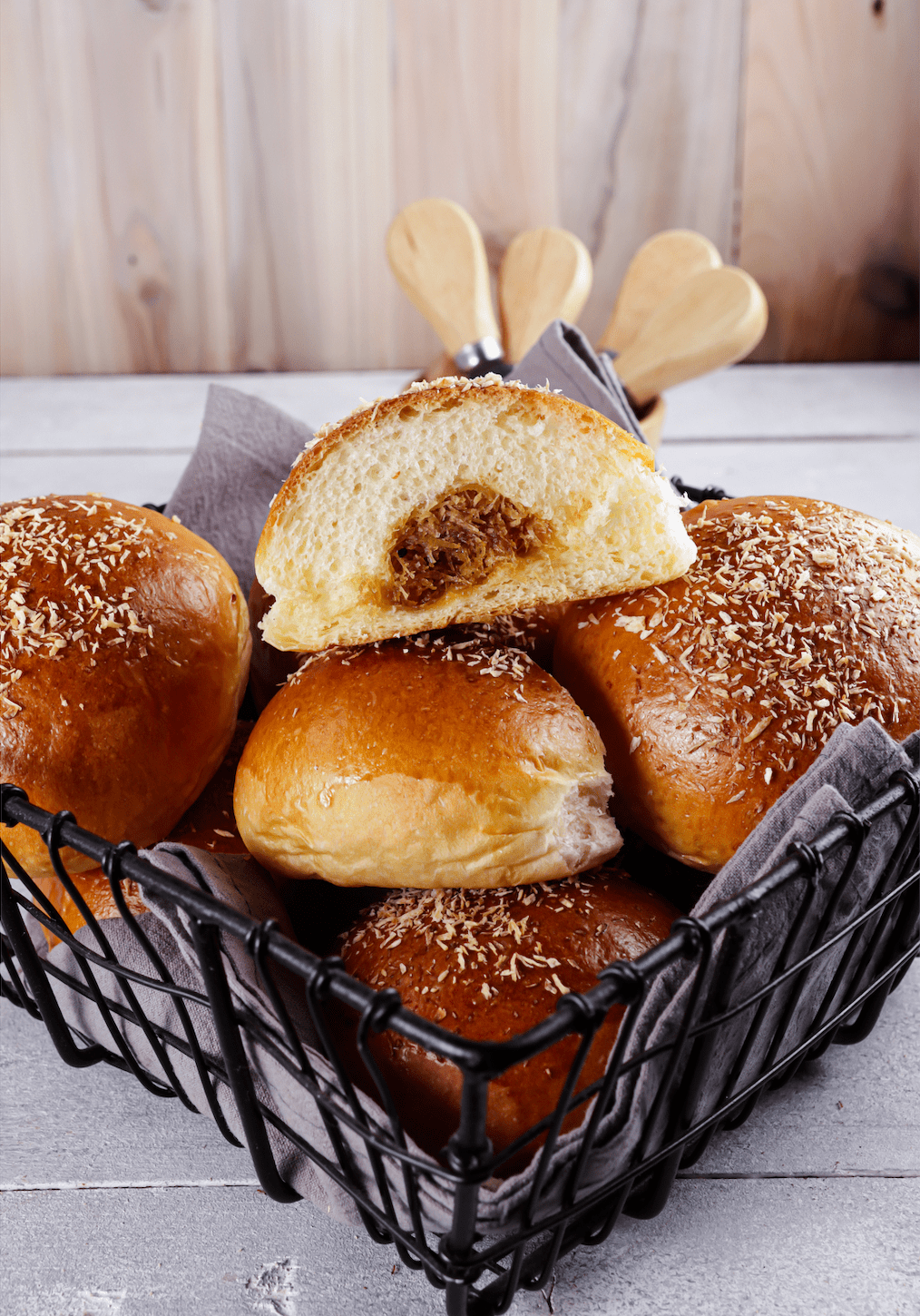 - Lalu isi adonan dengan bahan filling,lalu poles dengan bahan pemoles dan taburi dengan keju parmesan